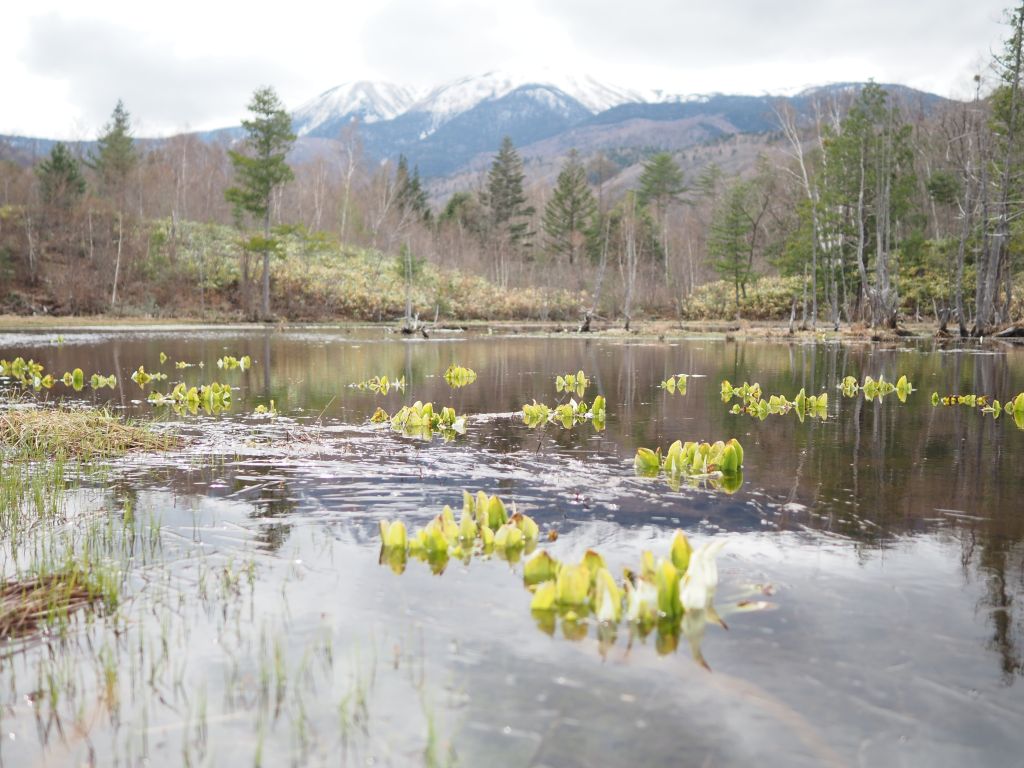 隣接する散策路では、水芭蕉、ショウジョウバカマ、ヒメイチゲ、リュウキンカなどが開花し彩りも鮮やかです。サンカヨウも白い蕾が早くも顔を覗かせています。