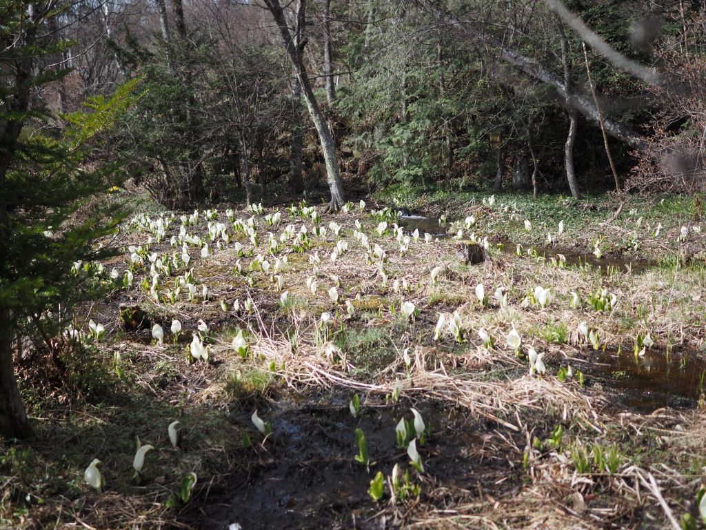 現在、水芭蕉は女小屋の森の群生地が見頃を迎えています。一の瀬のドジョウ池周辺はもう少し先になりそうです。